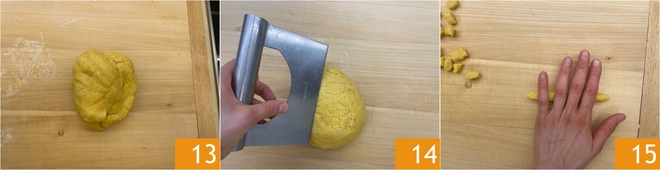 Amasse até obter uma massa lisa e homogênea 13. Envolva a massa com filme plástico para não secar e deixe descansar por 30 minutos à temperatura ambiente. Após o tempo de descanso, pegue uma parte da massa 14, assegurando-se de manter a outra sempre bem coberta. Forme cordões de 1 cm de espessura 15.