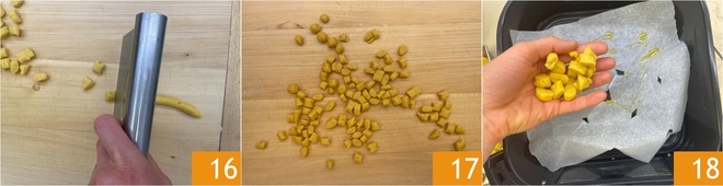 Com a ajuda de uma espátula, corte pedaços de aproximadamente 1-1,5 cm 16 e coloque-os de lado, bem separados uns dos outros 17. Forre a cesta da fritadeira a ar com papel manteiga perfurado, pulverize óleo vegetal e posicione dentro uma parte dos struffoli, mantendo-os separados 18. Usando uma fritadeira a ar com capacidade de 6 litros, você precisará fazer 3-4 fornadas.