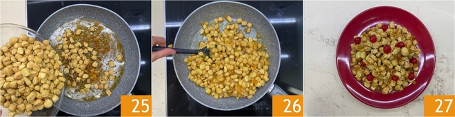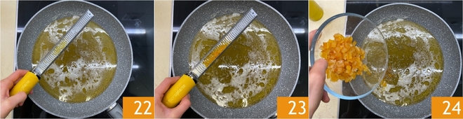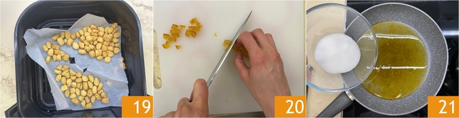 Cozinhe na fritadeira a ar a 190°C por 7 minutos, virando-os algumas vezes. Quando estiverem bem dourados 19, espalhe-os em uma bandeja para esfriar e continue com a cocção dos outros. Depois que todos os struffoli estiverem cozidos, corte a laranja cristalizada em cubos 20. Em uma panela à parte, adicione o mel e o açúcar 21.
