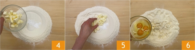 Corte a manteiga em cubos e coloque-a no centro 4. Comece a amassar com as mãos 5, depois adicione no centro os 2 primeiros ovos 6.
