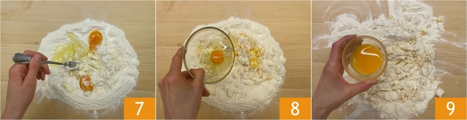 Misture com um garfo para incorporar 7, depois adicione também o terceiro ovo 8. Continue amassando, em seguida adicione as gemas 9.