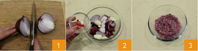 Para preparar o ensopado apimentado de frango com amendoim, limpe a cebola roxa e corte-a em pedaços 1; coloque-a em uma tigela com o alho e a pimenta 2. Triture tudo com um mixer ou um liquidificador de imersão 3 e reserve.