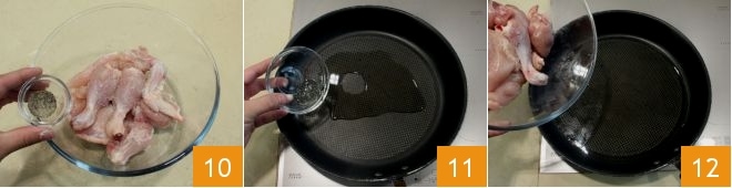 e a pimenta 10; em seguida, massageie a carne com as mãos para que ela fique saborosa. Aqueça o óleo de amendoim em uma panela grande antiaderente 11 e adicione os pedaços de frango 12 para dourar.