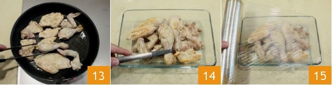 vire-o de ambos os lados 13 e cozinhe por cerca de 4-5 minutos de cada lado; depois retire o frango e mantenha-o aquecido 14, coberto com filme plástico 15.