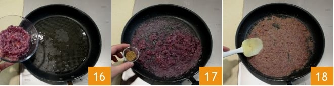Na mesma panela onde dourou o frango, adicione a mistura de cebola e alho 16, acrescente o cominho em pó 17 e misture 18, deixando refogar por alguns instantes.