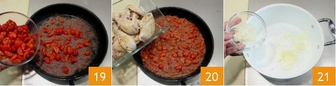 Depois adicione os tomatinhos 19 e continue cozinhando por cerca de 10 minutos até que os tomates liberem seu líquido e se desfaçam ligeiramente. Agora adicione também os pedaços de frango 20, deixe tomar sabor, depois cubra com água ou caldo de frango quentes e cubra com uma tampa: cozinhe por pelo menos 40 minutos em fogo bem baixo e verifique de vez em quando a cocção para que o líquido não seque muito. Enquanto isso prepare o arroz pilaf: pique finamente a cebola e em uma panela grande coloque para derreter a manteiga, adicione a cebola picada à manteiga derretida 21 e deixe refogar em fogo baixo por cerca de 15 minutos, até que fique transparente: cuidado para não dourar.