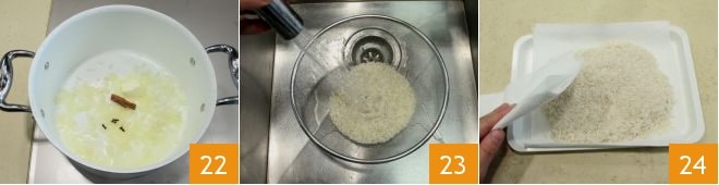 Adicione a canela e os cravos 22 e misture por mais dois minutos. Enquanto isso, lave o arroz em água corrente, deixe escorrer e secar completamente em uma bandeja forrada com papel absorvente 24.
