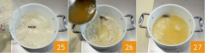 Adicione o arroz na panela 25 e deixe torrar por alguns instantes, mexendo com uma espátula de madeira. Em seguida, adicione todo o caldo (26-27). Cubra a panela com uma tampa (não deve haver saídas de vapor) e deixe cozinhar por pelo menos 18-20 minutos em fogo moderado até que o caldo seque completamente. Uma vez cozido e bem seco, retire o arroz pilaf do fogo, desgrude bem com um garfo e reserve.