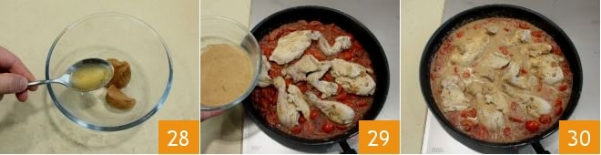 Em uma tigela, dilua a manteiga de amendoim com 2-3 colheres do caldo de cozimento do frango 28 e adicione à panela 10 minutos antes de terminar o cozimento do frango 29. Após o cozimento 30, sirva o ensopado apimentado de frango e amendoim quente acompanhado de arroz pilaf!
