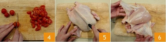 Lave também os tomates e corte-os em quartos 4, depois cuide do frango: limpe-o removendo a pele externa cortando-a com uma faca bem afiada 5; uma vez removida toda a pele 6, elimine também as várias partes de gordura que possam haver.