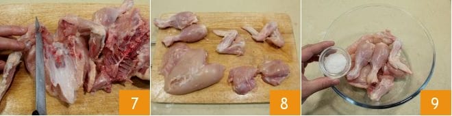 e então corte o frango em pedaços (7-8), removendo cuidadosamente também os ossinhos. Coloque o frango em uma tigela, adicione o sal 9
