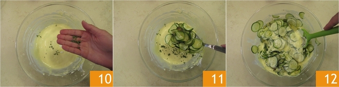 Acrescente também as folhinhas de tomilho 10. Junte ao preparo as abobrinhas mornas 11 e mexa para incorporá-las 12.
