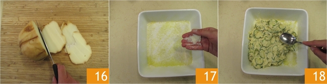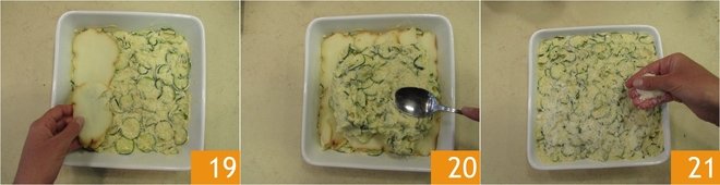 Coloque por cima as fatias de scamorza 19 e adicione o restante da mistura de abobrinha. Nivele novamente com as costas de uma colher 20 e polvilhe a superfície com o restante do Grana ralado 21.