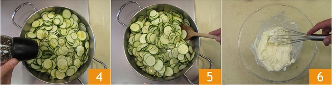 Junte agora as abobrinhas fatiadas, tempere com sal e pimenta 4 e deixe cozinhar por cerca de 10 min 5. Desligue o fogo e deixe amornar. Enquanto isso, coloque o queijo cremoso em uma tigela grande e bata com um batedor de arame 6.