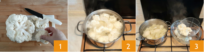 Para preparar o suflê de couve-flor, retire as folhas externas e o talo central, depois separe delicadamente os floretes usando uma faca pequena. Cozinhe os floretes em água fervente 2. Após 20 minutos estarão amolecidos, você sentirá com os dentes de um garfo. Escorra e amasse enquanto ainda estão quentes 3.