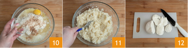 a noz-moscada 10 e misture bem tudo com uma colher 11. Corte a mozzarella em fatias finas e reserve 12.