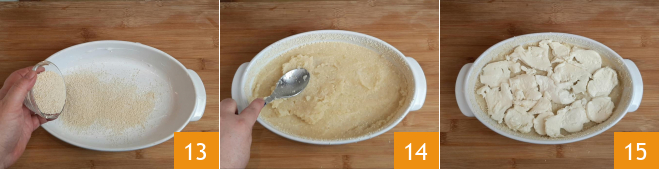 Unte uma assadeira com manteiga e polvilhe o interior com farinha de rosca 13. Despeje metade do purê de couve-flor e batata no fundo da assadeira e nivele com as costas da colher 14, depois cubra a superfície com uma parte da mozzarella 15.