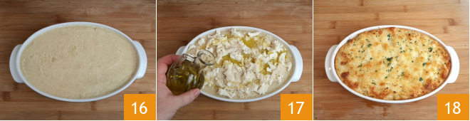 Agora comece despejando o restante do purê 16, sempre nivelando, e termine com a outra mozzarella restante. Polvilhe com farinha de rosca, despeje um fio de óleo e passe para a cozedura 17. Asse o suflê de couve-flor a 200° por cerca de 25 minutos em forno estático previamente pré-aquecido. Uma breve gratinada no final do cozimento para dourar a superfície e finalmente você poderá saboreá-lo: sirva com uma pitada de salsinha 18.