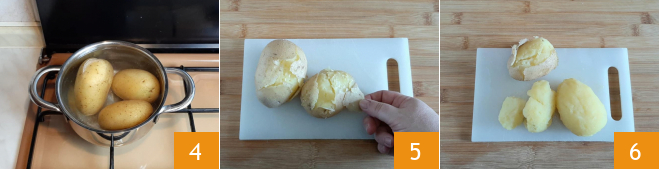 Enquanto isso, cozinhe também as batatas, colocando-as em uma panela grande cheia de água 4. Leve à fervura e cozinhe de 30 a 50 minutos dependendo do tamanho. Uma vez prontas (sempre faça o teste com o garfo), descasque-as enquanto ainda estão bem quentes 5: dessa forma, a pele sairá facilmente 6.