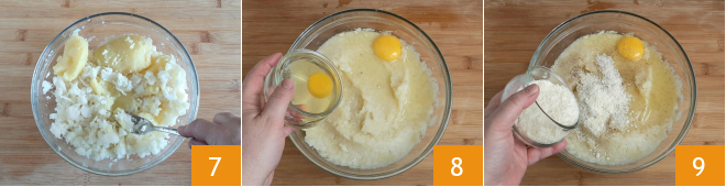 Amasse também essas na tigela com as couves-flores e obtenha um purê bem lisinho 7. Agora você pode adicionar os ovos 9, ajustar o sal e a pimenta, adicione o queijo ralado 9,