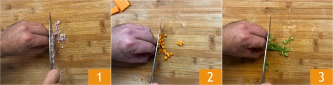 Para preparar o molho de cogumelos, primeiro coloque os cogumelos porcini de molho em água fria por cerca de 20 minutos, até que estejam reidratados. Pique finamente a chalota 1. Descasque e corte as cenouras, primeiro em tiras e depois em cubos de 1 cm de lado 2. Corte o aipo da mesma maneira 3.