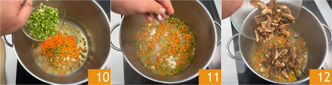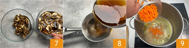 Escorra bem os cogumelos porcini 7 e coe a água deles passando por uma peneira fina 8. Em uma panela, coloque o óleo, adicione o alho, a chalota e as cenouras 9.