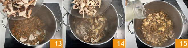 Adicione então os cogumelos portobello 13 e, após 3 minutos, os champignon 14. Cozinhe por 5 minutos e adicione o vinho branco 15.