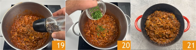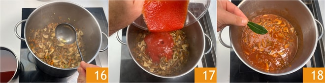 Quando toda a parte alcoólica tiver evaporado, adicione 4 conchas de água dos porcini 16 e continue cozinhando por mais 5 minutos. Adicione então o molho de tomate 17, uma folha de louro fresco 18 e mais 3 conchas de água dos porcini. Misture bem e cozinhe em fogo baixo por cerca de 1 hora.