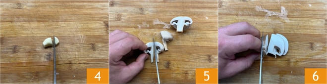 Limpe e corte ao meio um dente de alho 4. Corte os champignon em 4 partes 5, fatie os cogumelos portobello 6 e reserve.