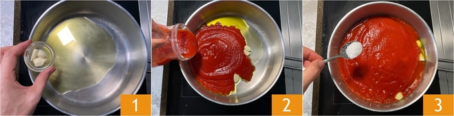 Para preparar os supplì alla norma, comece pelo molho. Em uma panela, doure três dentes de alho no azeite de oliva extra virgem 1. Despeje o purê de tomate 2 e tempere com o sal fino 3.