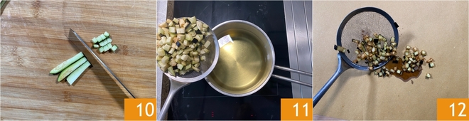 Enquanto isso, cuide das berinjelas. Corte-as em cubos 10, frite-as em óleo de sementes a 160 graus por três minutos 11 e quando estiverem douradas, escorra-as em papel absorvente 12.