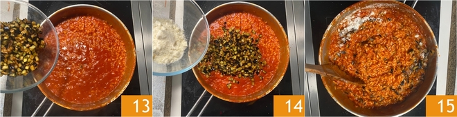 Quando o arroz estiver pronto, adicione as berinjelas fritas 13, misture com o Parmigiano ralado 14 e mexa bem para incorporar todos os ingredientes 15.