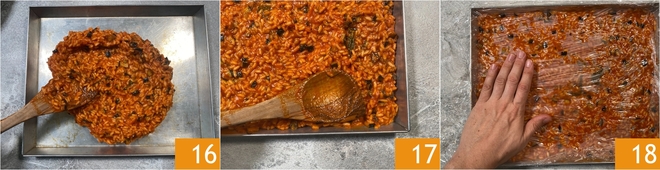 Transfira o arroz para uma assadeira grande o suficiente 16, distribua-o bem para obter uma camada não muito espessa 17. Cubra-o com filme plástico em contato 18, deixe chegar à temperatura ambiente e depois leve à geladeira para firmar por pelo menos duas horas.