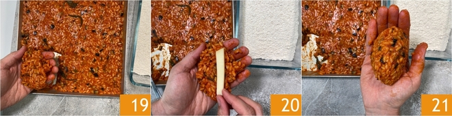 Após esse tempo, pegue o arroz firme, com as mãos molhadas, pegue uma porção de arroz e recheie com uma fatia de scamorza defumada 20. Ainda com as mãos úmidas, feche bem cada supplì, tentando não deixar a scamorza sair 21.