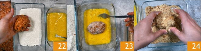 Cuide da empanagem dos supplì: passe-os primeiro na farinha 22, depois nos ovos batidos 23 e, por fim, na farinha de rosca 24.