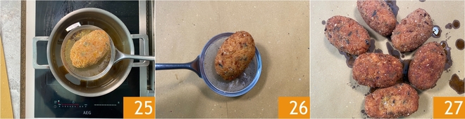 Aqueça o óleo de sementes a 160 graus e frite um supplì por vez 25 por cerca de três minutos. Quando estiver bem dourado e crocante, escorra-o em papel absorvente 26, continue assim com todos os outros supplì 27 e sirva-os quentes!