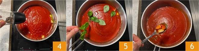 Aromatize com uma pitada de pimenta-do-reino 4 e folhas de manjericão fresco 5. Após cerca de 20 minutos de cozimento em fogo brando, retire os dentes de alho 6.
