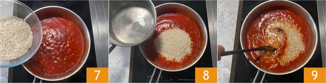 Agora você pode adicionar o arroz ao molho 7, despeje a água fervente 8 e cozinhe em fogo médio-baixo por vinte minutos, mexendo frequentemente 9. Assim, o arroz não grudará no fundo e absorverá todo o líquido.