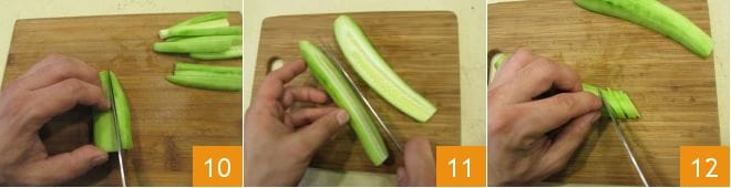 Pegue um e corte-o ao meio e depois ao longo do comprimento do legume em fatias de 6-7 mm 10. Estas fatias de pepino serão usadas para o recheio do maki. Em seguida, pegue o outro pepino e corte-o ao meio no sentido do comprimento 11. Depois corte em fatias bem finas no sentido horizontal do legume, mantendo-as unidas enquanto as corta 12. Estas últimas serão usadas para decorar a parte superior externa do maki.