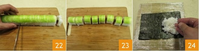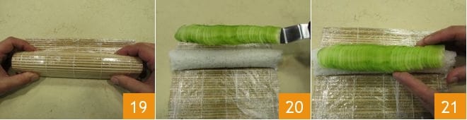 Exerça uma leve pressão com as mãos começando do centro do rolo e deslizando para fora para compactá-lo 19. Depois puxe a borda inferior da esteira para frente (como na figura 18), exercendo novamente pressão com as mãos do centro até deslizar para as bordas. Nestas operações, a esteira não deve enrolar-se sobre si mesma, mas apenas facilitar o fechamento do rolo. Repita a operação até que as duas extremidades do arroz se encontrem e assim obter o seu maki. Agora mova as fatias de pepino esmagadas para o topo do maki ajudando-se com uma espátula para mantê-las compactas 20. Coloque-as de modo a cobrir toda a superfície do maki e, se necessário, ajuste-as com as mãos 21. Em seguida, compacte novamente o maki com a esteira, como você fez nos passos anteriores, para compactar também a decoração.