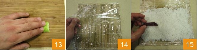Agora pressione com os dedos sobre as pequenas fatias de pepino ainda unidas para deitá-las, formando uma fileira oblíqua 13 e deixe-as de lado. Estas fatias serão usadas para decorar a parte superior do maki. Neste ponto, pegue uma esteira de bambu e coloque um filme plástico transparente 14. Molhe as mãos em uma tigela de água levemente acidulada para evitar que o arroz, que será bastante pegajoso, grude nelas. Coloque na esteira de bambu cerca de 100 g de arroz, formando um retângulo de cerca de 10x15 cm. Coloque no centro as 3 tiras de beterraba 15.