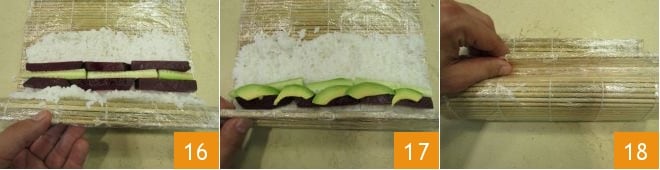 dispondo-as uma após a outra; ao lado crie uma fileira de tiras de pepino e depois ao lado mais uma de beterraba 16 para criar uma alternância de cores. Por fim, sobre elas coloque as de abacate 17. Agora você pode fazer o maki: segure a borda inferior da esteira de bambu, levante-a para levá-la para o centro 18.