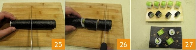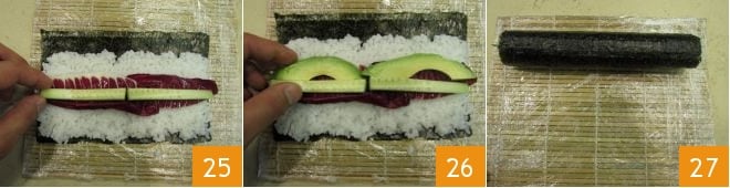Coloque no centro uma folha de chicória dividida ao meio, sobre ela coloque uma fileira de fatias de pepino 25 e ao lado uma de abacate 26. Então, enrole delicadamente a esteira de bambu como indicado nos passos anteriores para compactar o maki 27.