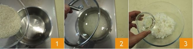 Para preparar o sushi vegetariano, comece cozinhando o arroz. Pegue uma panela de bordas altas e coloque água e arroz nela 1. Cubra com a tampa e leve para ferver 2. Quando a água ferver, abaixe o fogo e deixe cozinhar em fogo baixo por cerca de 15 minutos. Não mexa o arroz. Quando estiver cozido, transfira o arroz para uma tigela e adicione o vinagre 3.