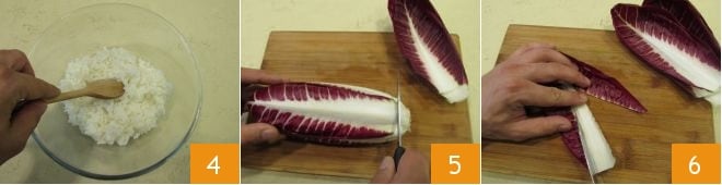 Misture delicadamente o arroz com uma colher ou espátula de madeira até que esteja em temperatura ambiente (você pode usar um leque ou um pratinho de plástico para esfriar e evaporar o vinagre mais rapidamente) 4 e reserve. Em seguida, prepare os legumes. Lave bem os legumes e comece com a preparação da chicória: retire a parte final do maço 5, depois destaque as folhas e de cada uma retire a nervura central branca 6. Coloque as folhas de chicória assim obtidas em uma tigelinha e reserve.