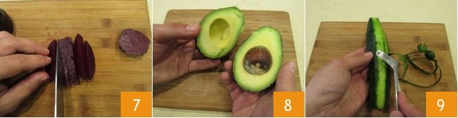 Em seguida, pegue a beterraba: corte-a em fatias finas de 6-7 mm 7 e reserve. Passe para o abacate: divida-o ao meio, retire o caroço interno 8 e depois corte em pequenos pedaços de cerca de 6-7 milímetros. Por fim, pegue os pepinos, retire as extremidades e a casca com um descascador de legumes 9.