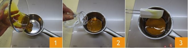 Para preparar as susumelle, comece a colocar o mel em uma panela 1, adicione a água 2 e aqueça suavemente em fogo baixo 3, apenas o tempo suficiente para derretê-lo.