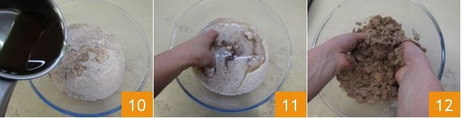 Incorpore também o mel já morno 10 e misture com as mãos 11 até obter uma massa bastante uniforme 12.