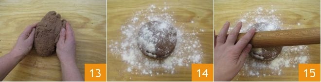 Neste ponto, transfira para uma superfície 13, polvilhe com um pouco de farinha 14 e estenda com um rolo 15