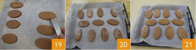Transfira-os gradualmente para uma assadeira forrada com papel manteiga 19, dispondo-os bem espaçados entre si 20. Asse em forno estático na prateleira do meio a 190° por cerca de 15 minutos (temperatura e tempos devem ser ajustados de acordo com seu forno; assim que ver as rachaduras na superfície dos biscoitos, será o momento de retirá-los). Uma vez prontos, você pode retirar a assadeira do forno 21